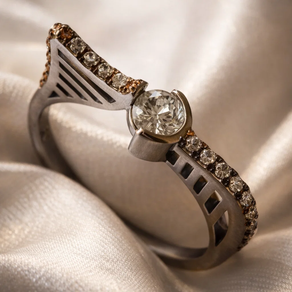 The Aurora Crest Solitaire Ring is a graceful fusion of architectural design and timeless brilliance. Featuring a luminous round-cut centerpiece, this ring is elevated by a sculpted, split-band silhouette accented with fine crystal detailing along its crest. The openwork structure beneath the stone adds depth and dimension, creating a light, airy elegance that reflects modern craftsmanship. Designed to embody subtle grandeur, this piece is perfect for those who seek understated luxury with a contemporary edge, making it ideal for both formal occasions and sophisticated daily wear.