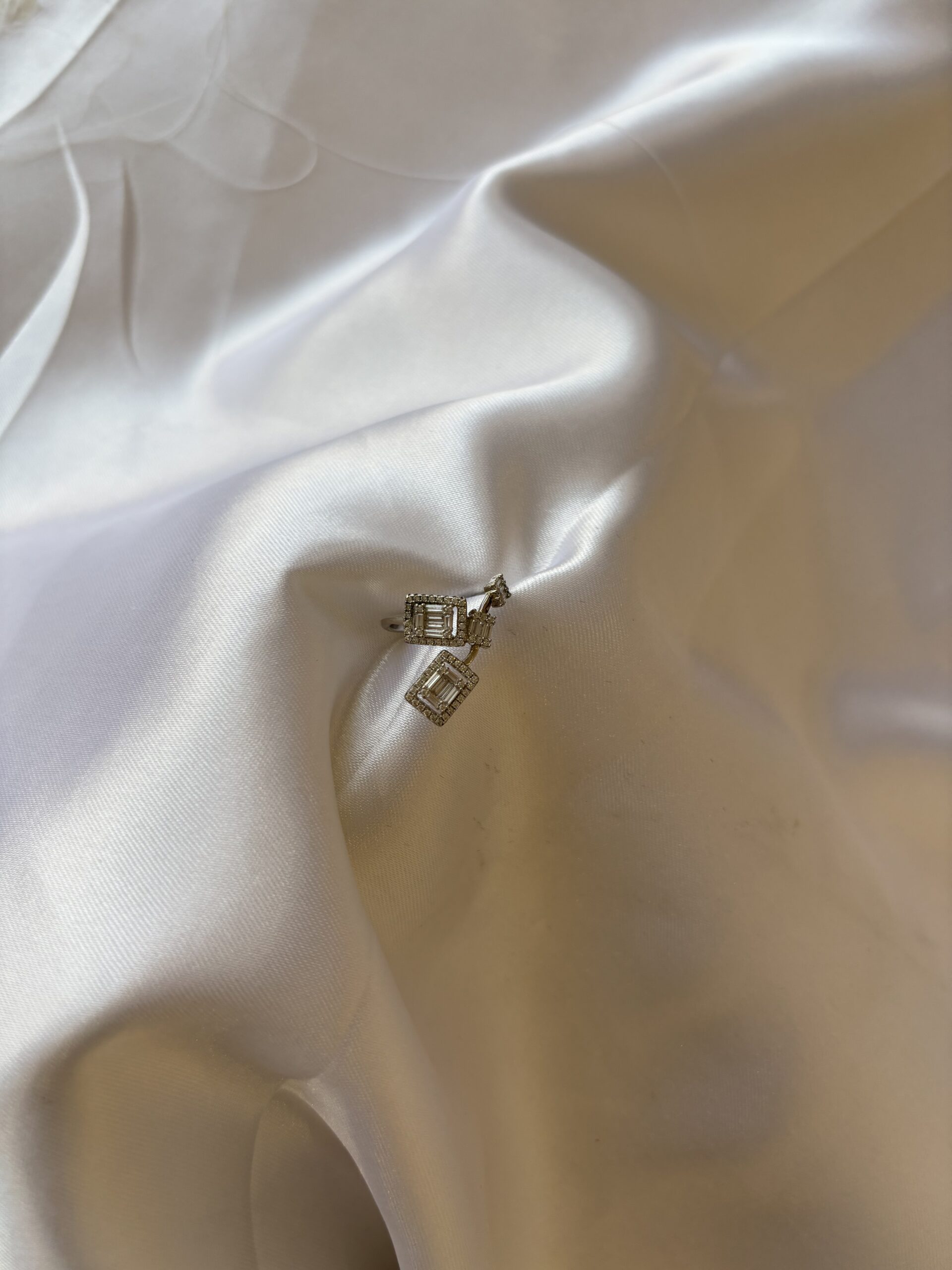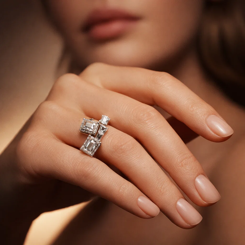 The Celeste Cascade Diamond Ring is a refined statement of modern elegance, designed to reflect light with graceful movement and architectural precision. Featuring a trio of emerald-cut, crystal-like stones set within delicate pavé frames, this silver-toned ring creates a cascading silhouette that feels both contemporary and timeless. Each geometric form is meticulously aligned to enhance brilliance and depth, offering a sophisticated balance between structure and softness. Ideal for evening occasions or elevated everyday wear, this piece embodies understated luxury and celestial charm.