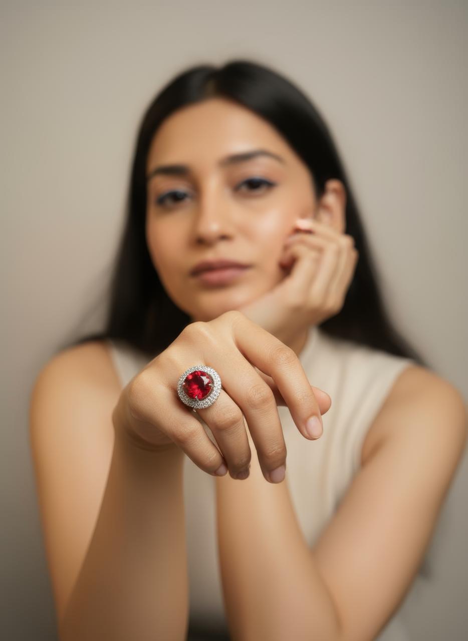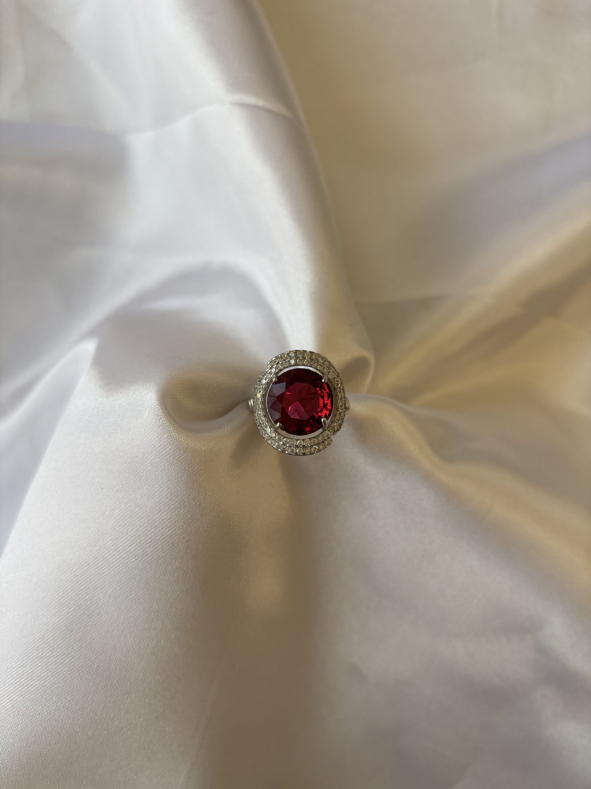A ruby-toned centerpiece ring framed by a double crystal halo for bold, regal elegance.