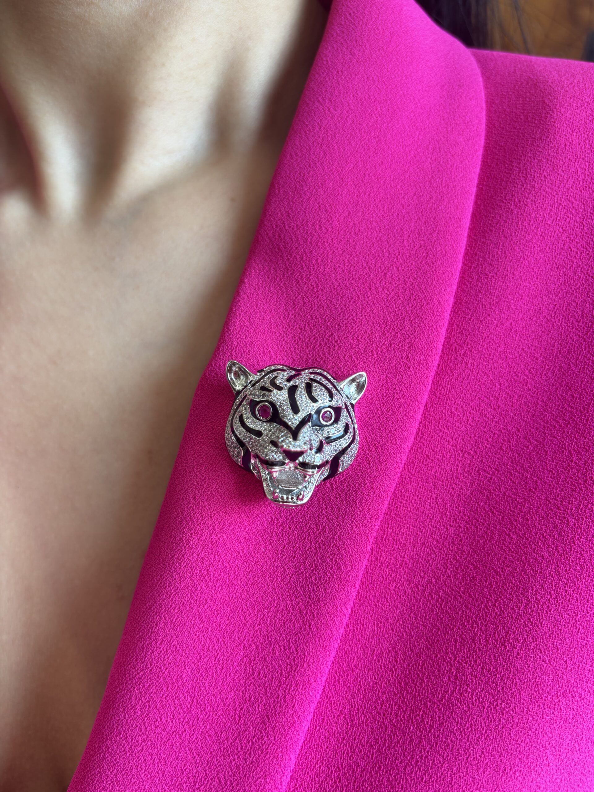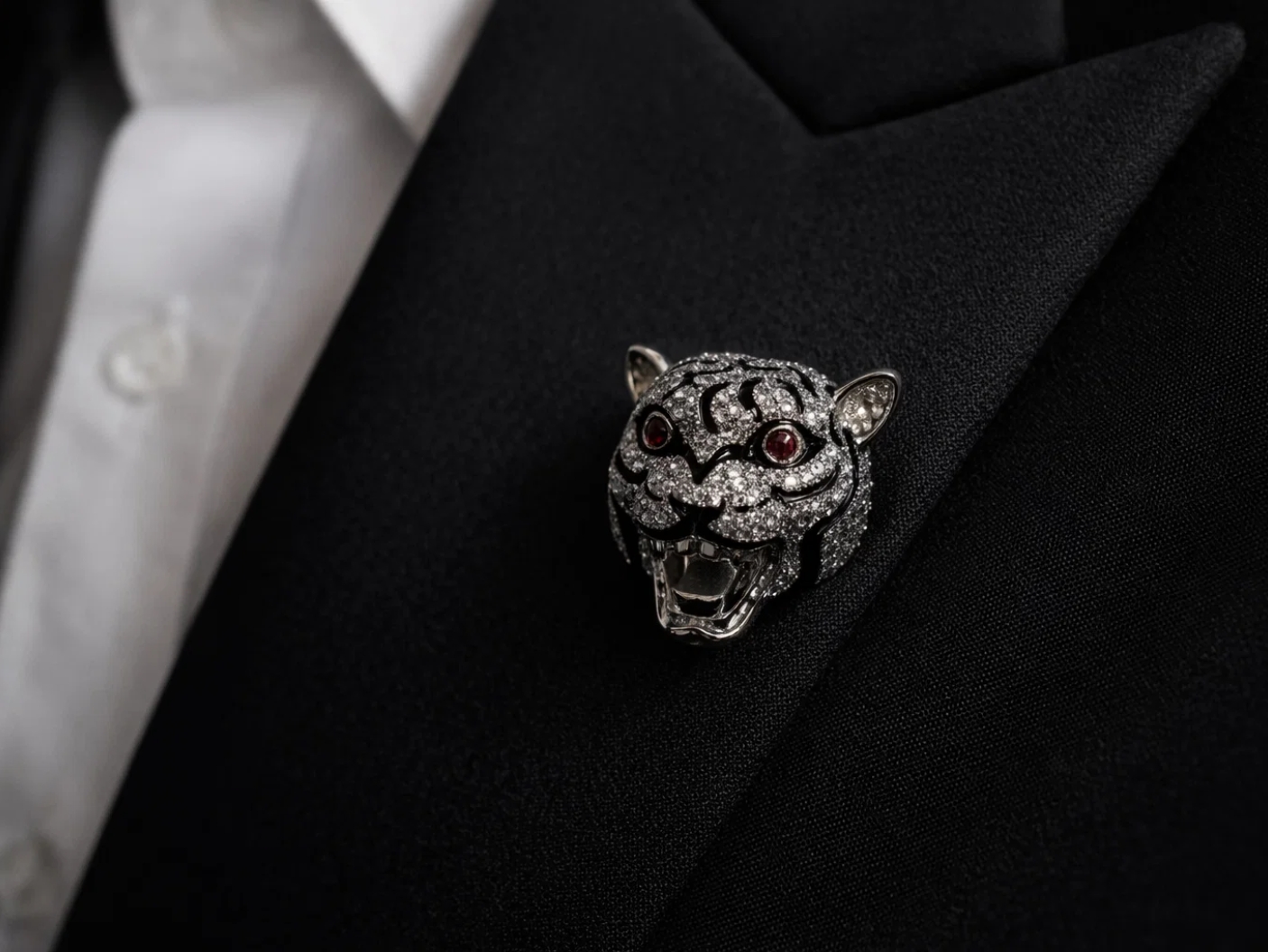 The Crystal Tiger Head Brooch is a statement accessory that symbolizes strength, authority, and bold style. Crafted with intricate crystal work, striking black enamel accents, and deep red stone eyes, this brooch delivers a commanding presence. Its detailed tiger-head design makes it an ideal accent for sherwanis, bandhgalas, Nehru jackets, and statement blazers. Perfect for weddings, festive occasions, and evening events, this brooch is made for men who want their accessories to reflect confidence, dominance, and refined craftsmanship.