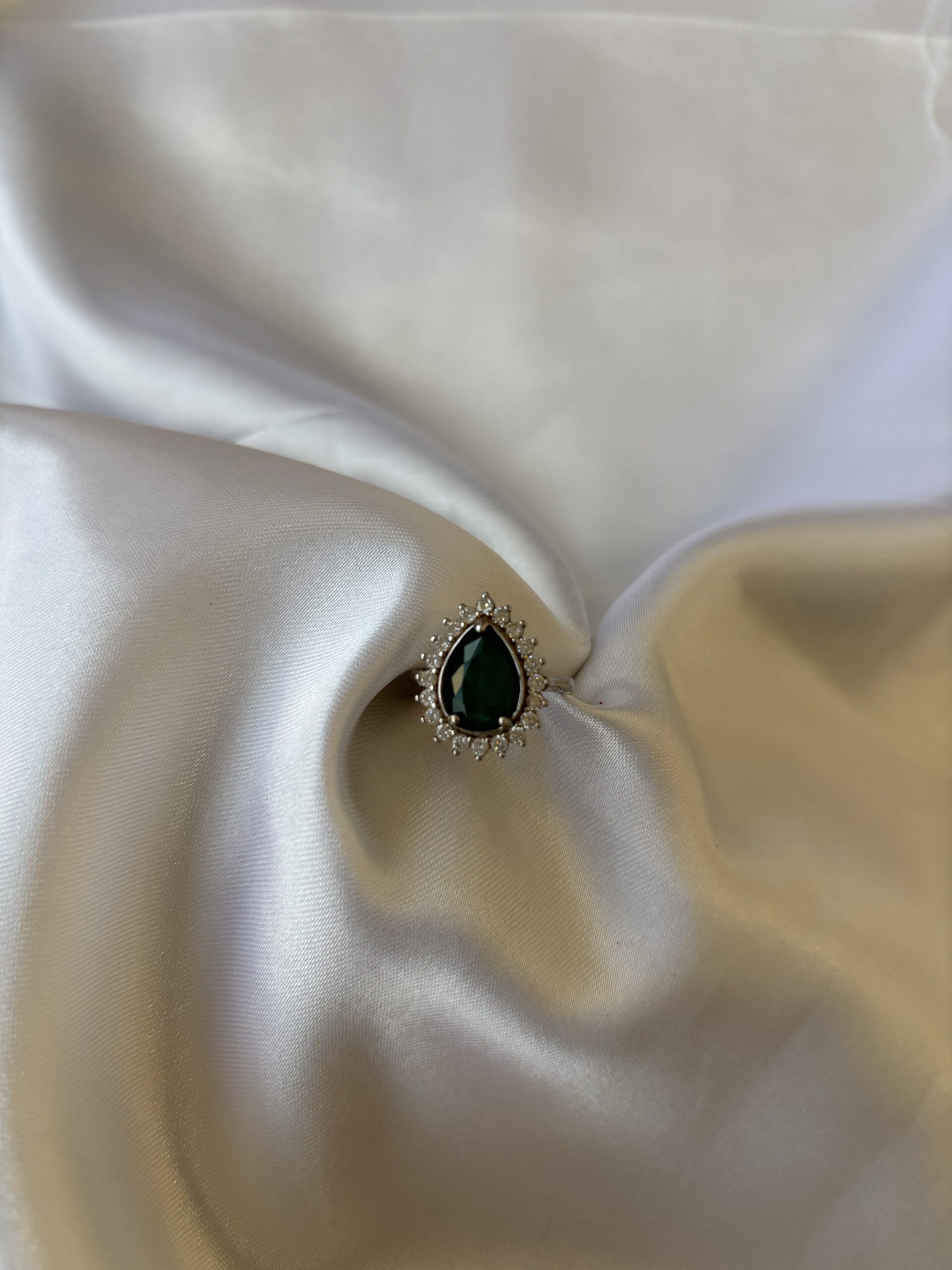 A pear-shaped emerald-toned ring framed by a sparkling crystal halo for timeless elegance.