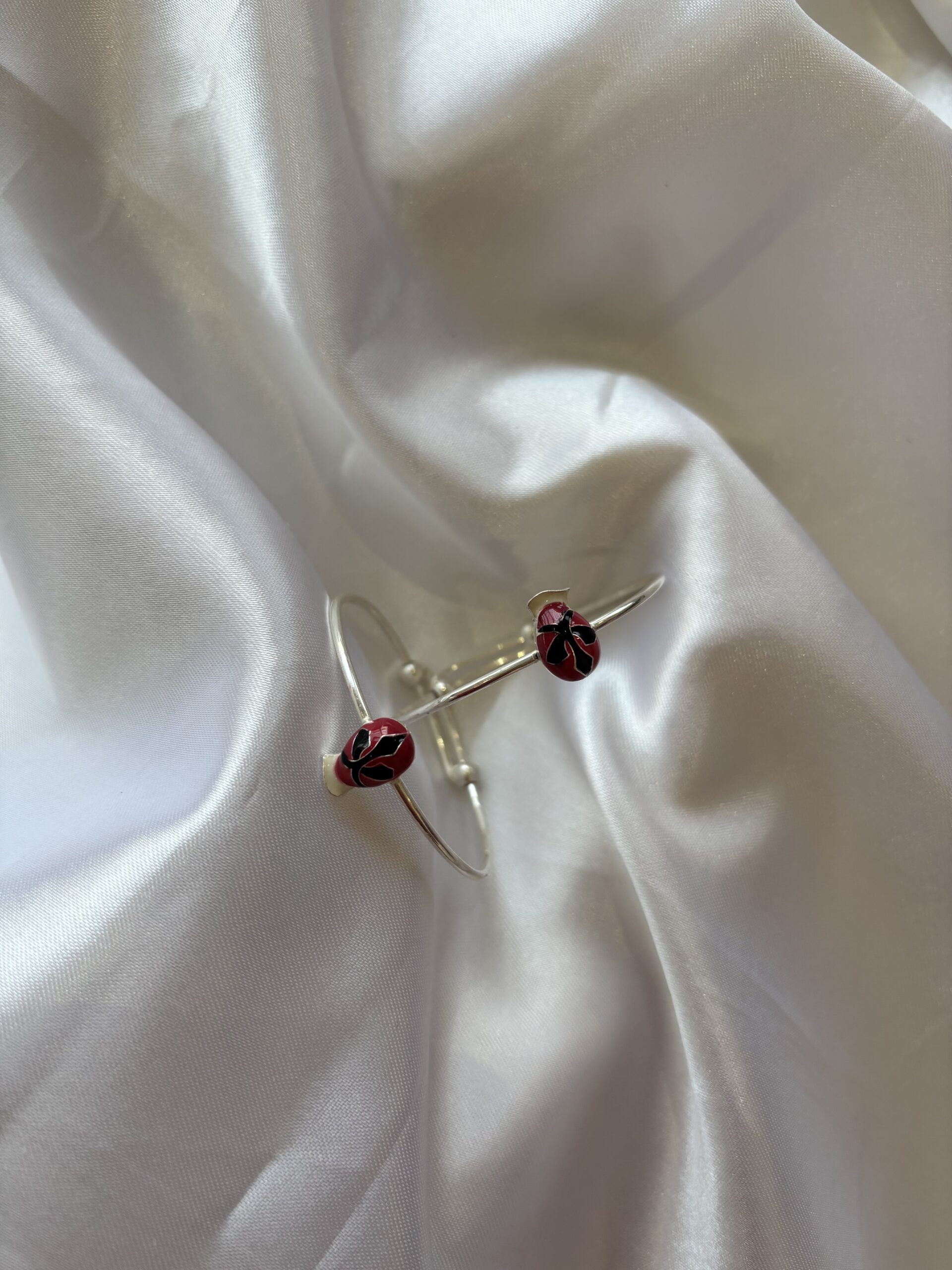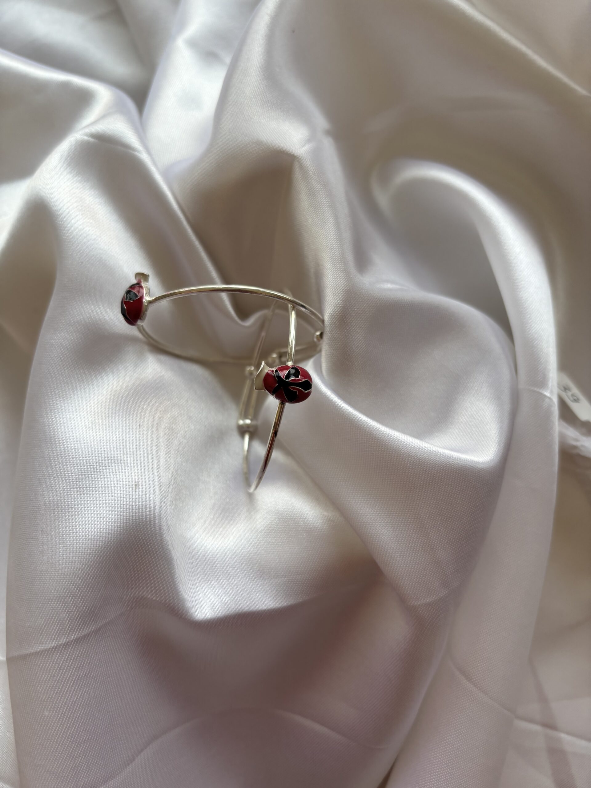 Charming silver bangles for kids, adorned with cute ladybug beads for a fun and cheerful touch.