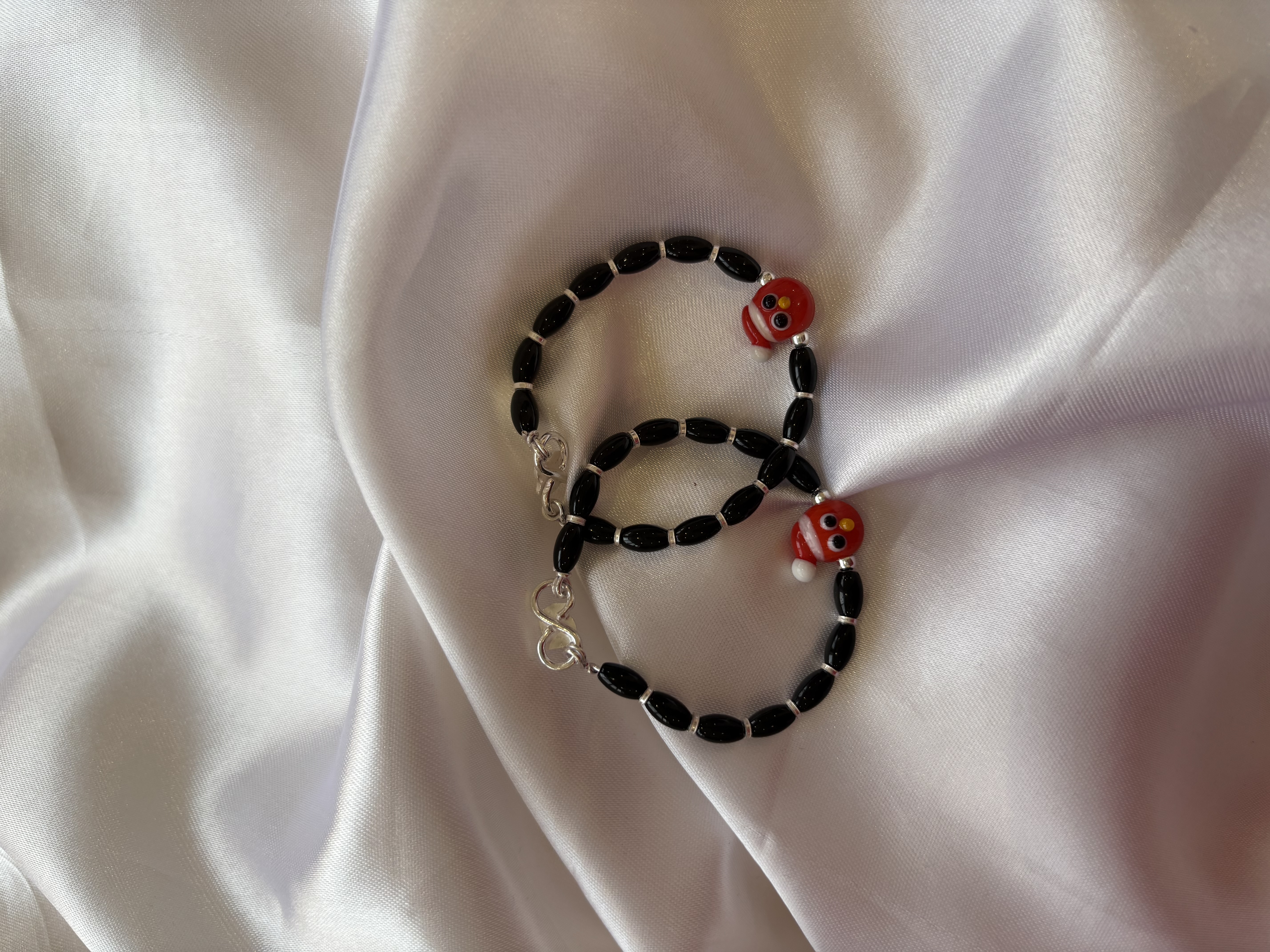 A charming silver bracelet for kids, crafted with smooth black beads and finished with an adorable handcrafted charm.