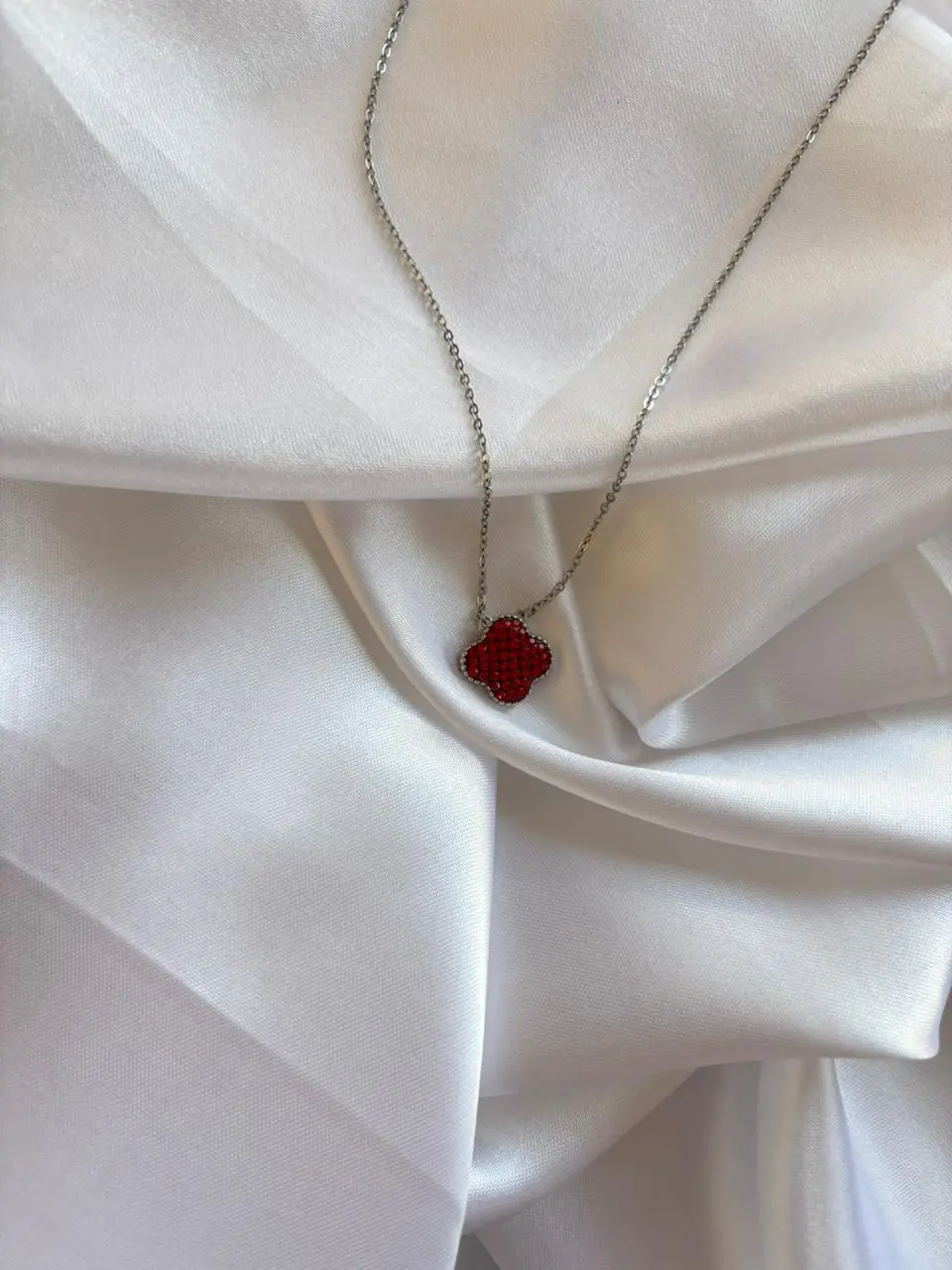 Make a statement with the Ruby Clover Charm Necklace, a striking blend of elegance and vibrant color. Featuring a deep red, crystal-studded clover-shaped pendant, this necklace rests gracefully on a delicate silver-tone chain for a refined yet eye-catching look. The rich ruby hue adds a touch of luxury, making it perfect for evening wear, festive occasions, or adding a bold accent to everyday outfits. Lightweight and comfortable, this piece is designed to elevate your style with timeless charm and modern flair.