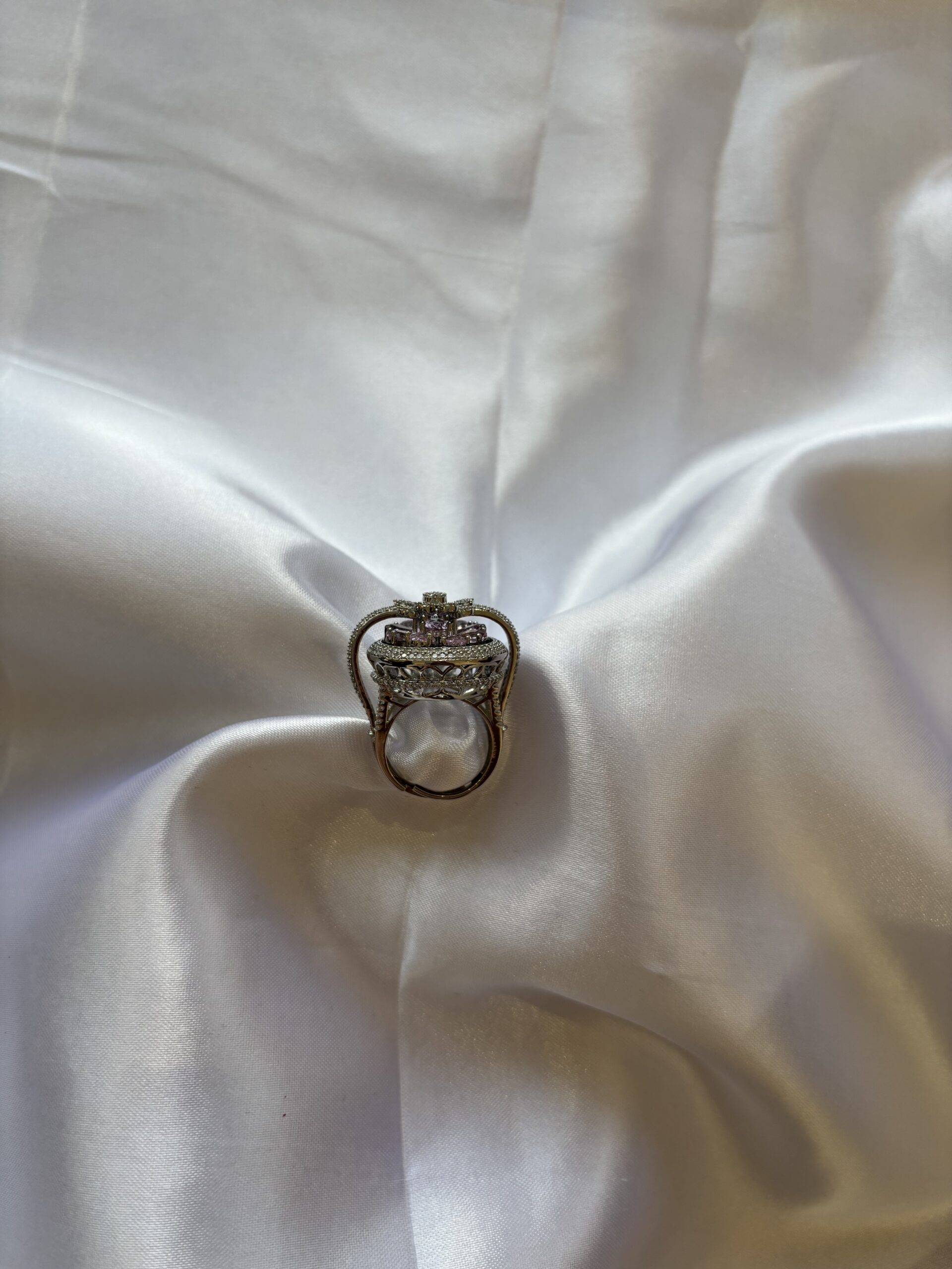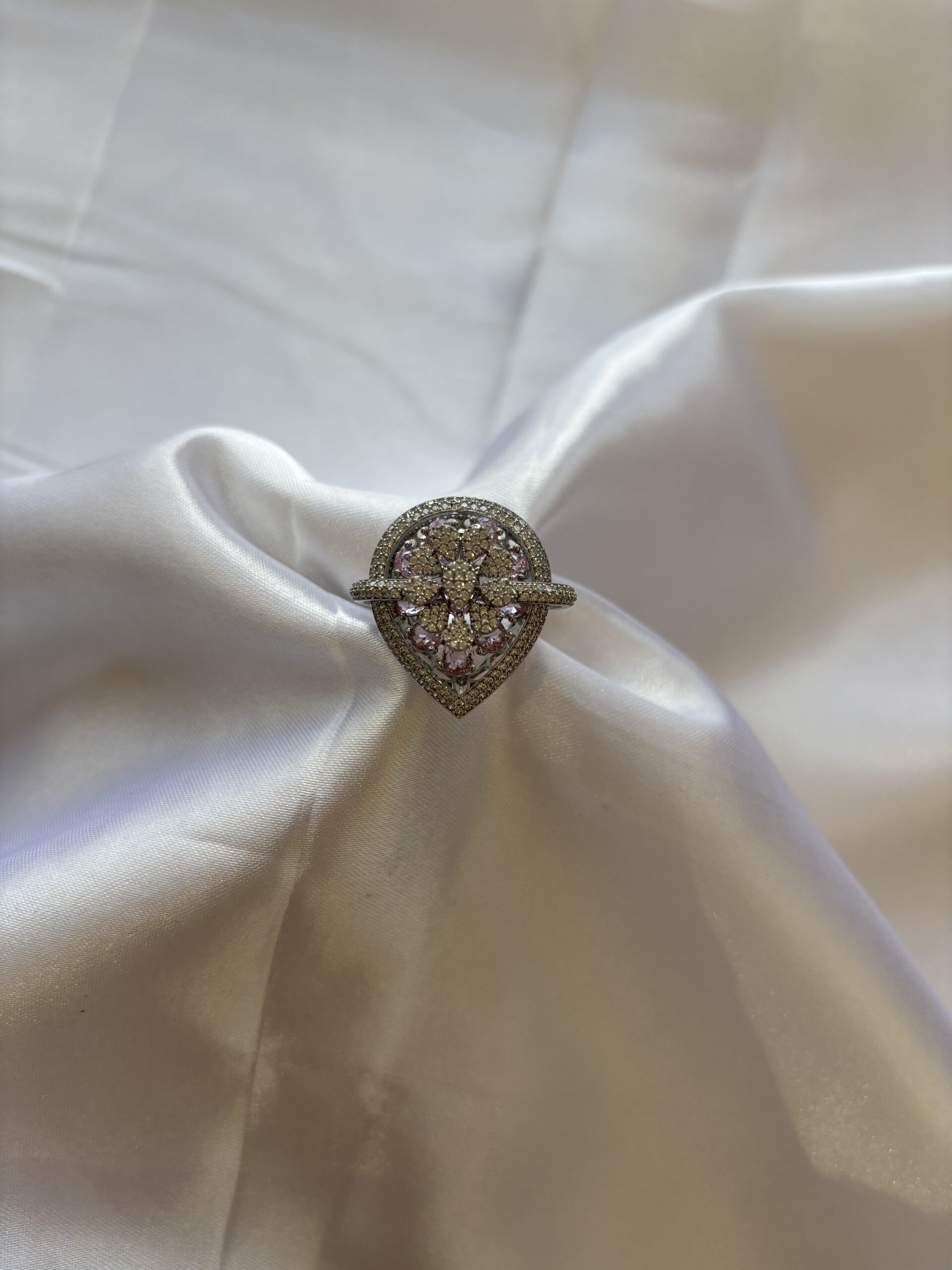 The Silver Blush Floral Shield Ring is a celebration of intricate craftsmanship and refined elegance. Designed in a distinctive shield shape, the ring showcases a delicate floral pattern at its centre, highlighted with blush-toned stones and bordered by finely set accents that add depth and brilliance.